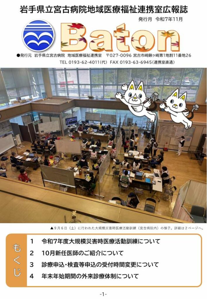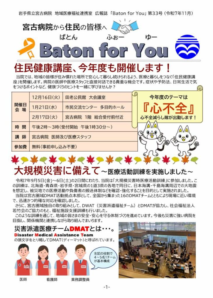 当院地域医療福祉連携室では、定期的に医療機関等向け広報誌「Baton」と住民の皆さま向けリーフレット「Baton for You」を発刊しております。この度、令和7年11月号ができあがりましたのでご覧下さい。