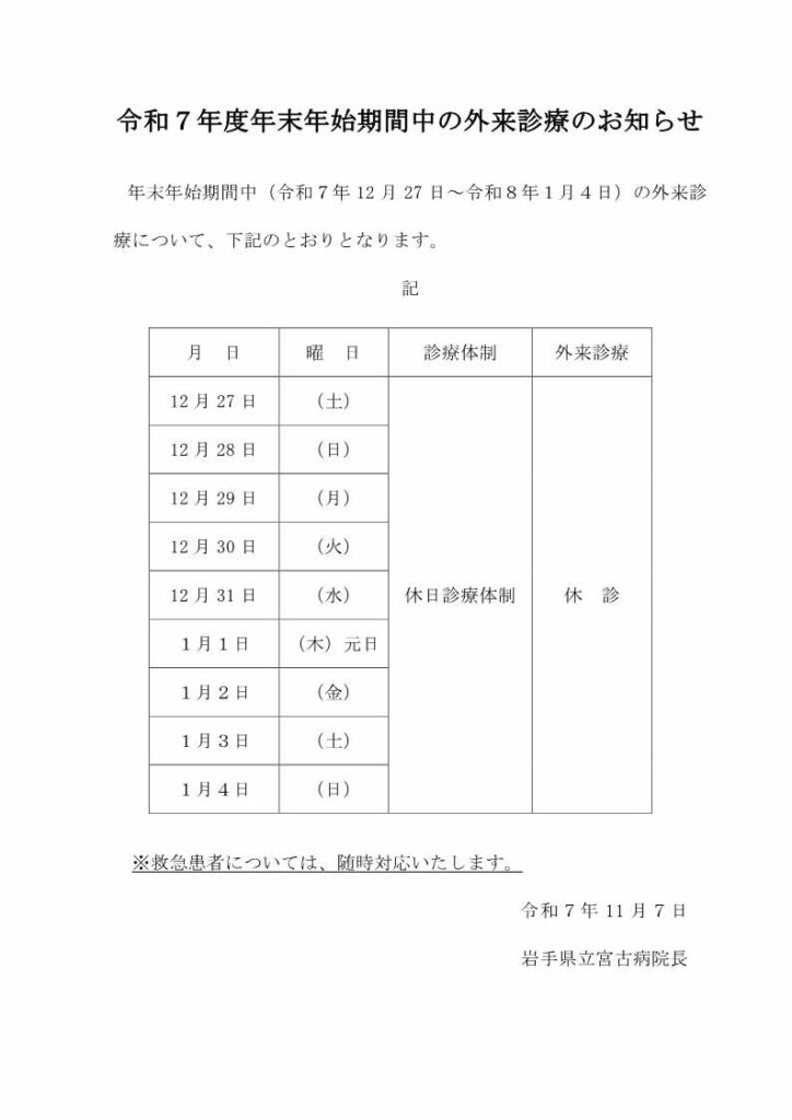令和7年度年末年始期間中の外来診療について